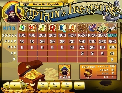 Игровой автомат «Сокровища капитана» представлен в виде пяти вращающихся барабанов и 25 линий для формирования оплачиваемых комбинаций. Количество необходимых игровых полос не фиксированное. Клиент самостоятельно перед запуском игрового процесса устанавливает необходимое количество способов формирования оплачиваемых цепочек.
