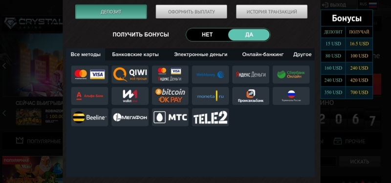 Для депозита работают популярные Виза, Мастеркард, Киви и иные платежные системы. Для вывода выигрыша из интернет казино Кристалл пользуются: Яндекс Деньги, Виза и прочие.