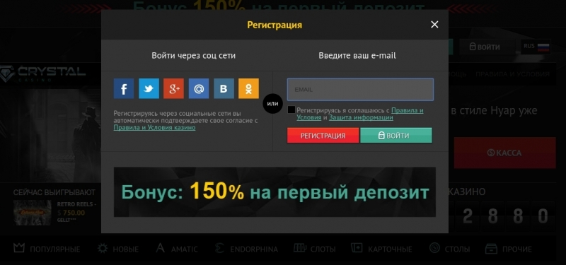 Вход и регистрация на официальном сайте Crystal Casino