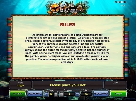 Видео слот Orca – это традиционный пяти барабанный игровой аппарат. Оплачиваемые цепочки собираются на 50 полосах. Активные полосы можно изменять по усмотрению клиента.