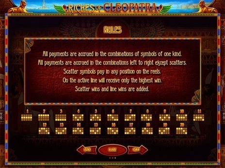 «Riches of Cleopatra» или «Сокровища Клеопатры» - это игра, которая имеет 5 барабанов и 20 игровых линий. Сколько из них одновременно задействовать решает сам игрок. На барабанах расположены игровые символы, которые во время игры могут образовывать выигрышные комбинации.