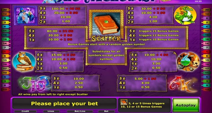 3, 4 и 5 изображений магической книги приносят клиентам 10, 12 и 15 фри спинов соответственно. Ставка остается прежней. Изюминкой бесплатных вращений на видео слоте The Alchemist есть знак, сделанный из золота, который появляется на барабанах. Именно этот символ увеличивает призовые выплаты в раунде бесплатных вращений и продлевает игру.